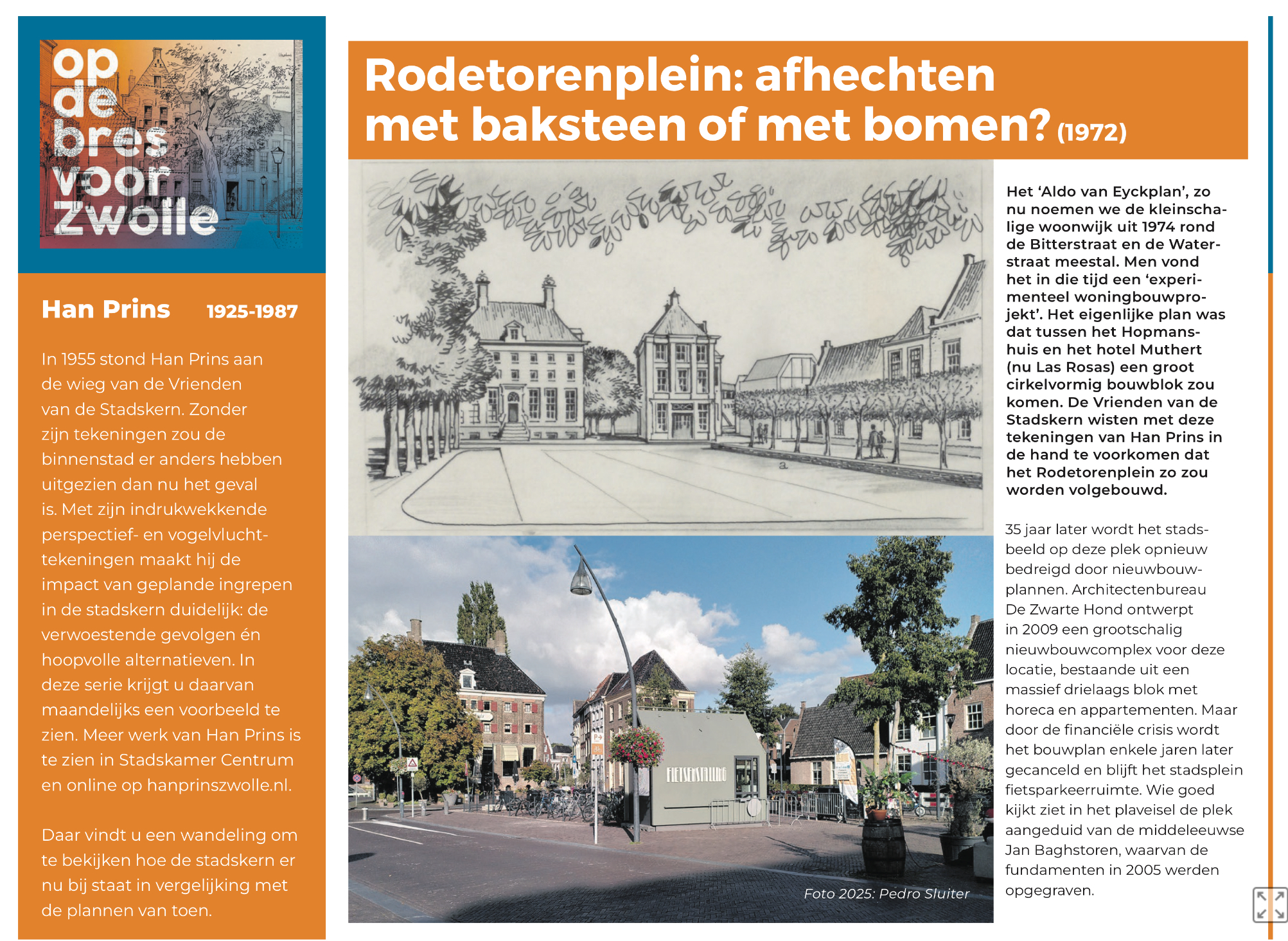 In 1955 stond Han Prins (1925-1987) aan de wieg van de Vrienden van de Stadskern Zwolle. Zonder zijn tekeningen zou de binnenstad er anders hebben uitgezien dan nu het geval is. Met zijn indrukwekkende perspectief- en vogelvluchttekeningen maakte hij de impact van geplande ingrepen in de stadskern duidelijk: de verwoestende gevolgen én hoopvolle alternatieven. Onze vereniging heeft zijn schetsen indertijd vaak benut om haar argumenten kracht bij te zetten.