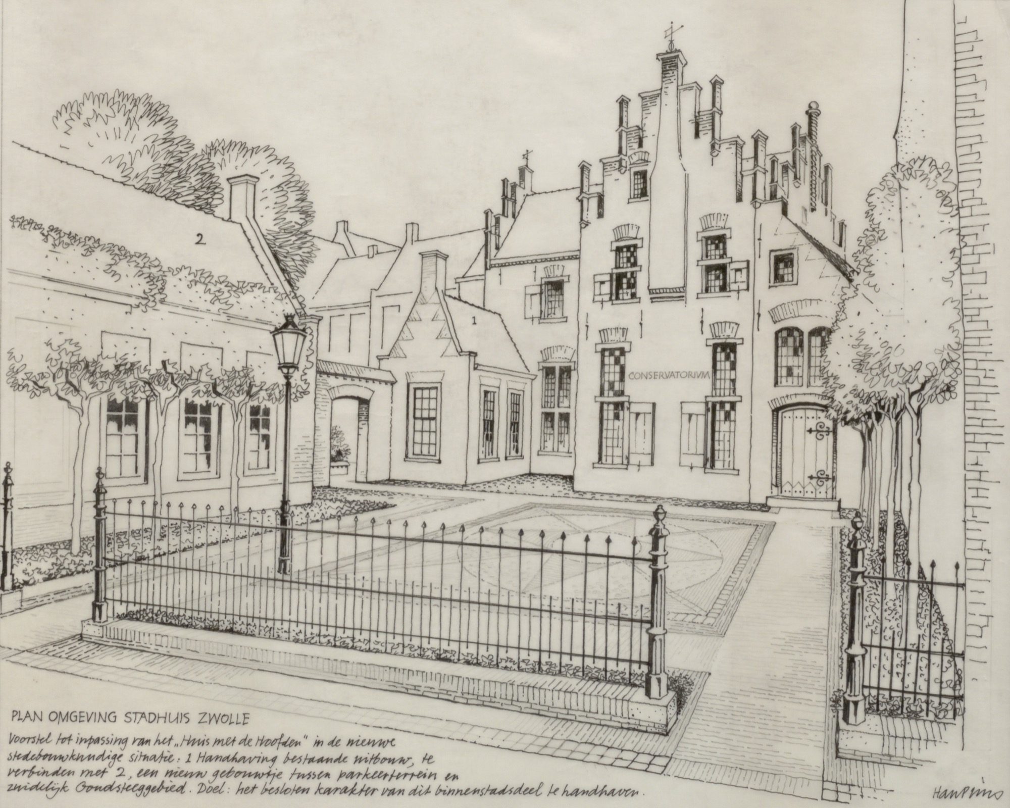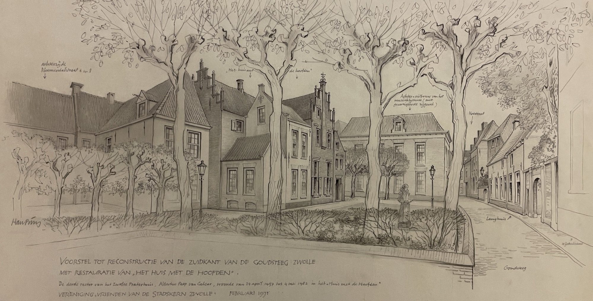 Een onderzoek door de Vrienden van de Stadskern bracht aan het licht dat het ging om sloop van een van de meest authentieke middeleeuwse woonhuizen van Nederland! De Vrienden ondernamen actie en Han Prins maakte schetstekeningen van het complex, die enkele dagen voor de geplande sloop aan burgemeester Drijber werden gepresenteerd. De tekeningen van Prins bleken weer eens een succesformule te zijn: de sloop werd opgeschort.