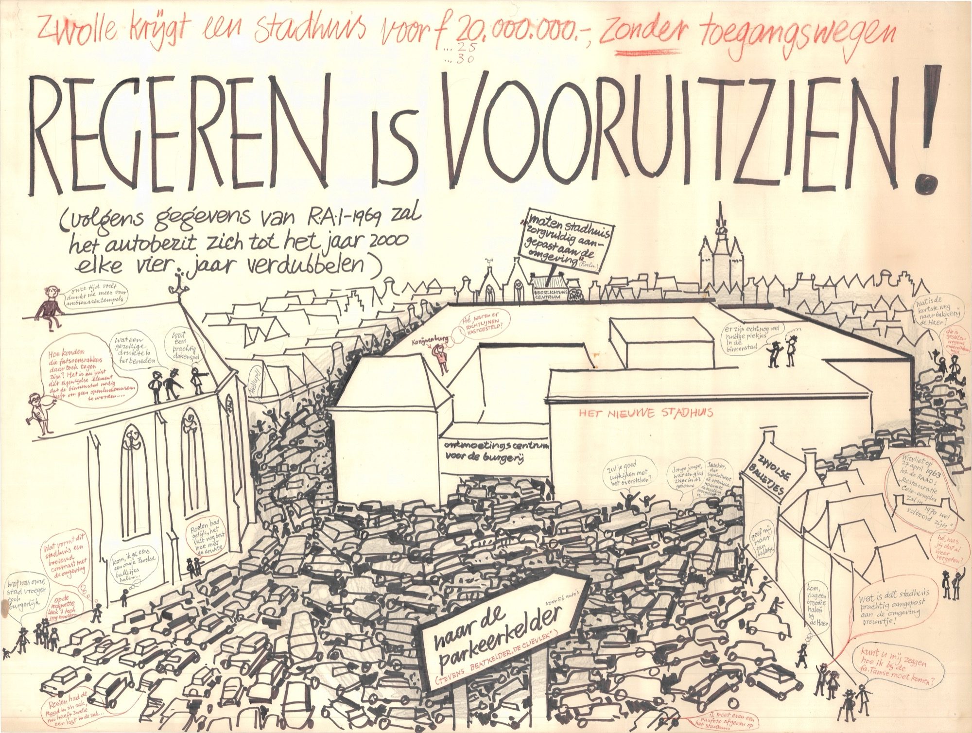 Voor deze campagne maakte Han Prins onder meer deze spotprent met een afbeelding van het nieuwe stadhuis temidden van een enorme stroom van vastgelopen auto’s. Een van de tegenargumenten tegen het plan was dat de bouw van het nieuwe stadhuis zou leiden tot een forse toename van het autoverkeer in de binnenstad. Het ontbreken van een goed verkeersplan versterkte de vrees dat het nieuwe stadhuis nog meer autoverkeer naar de binnenstad zou aantrekken, niet alleen van ambtenaren maar ook van bezoekers aan het stadhuis.