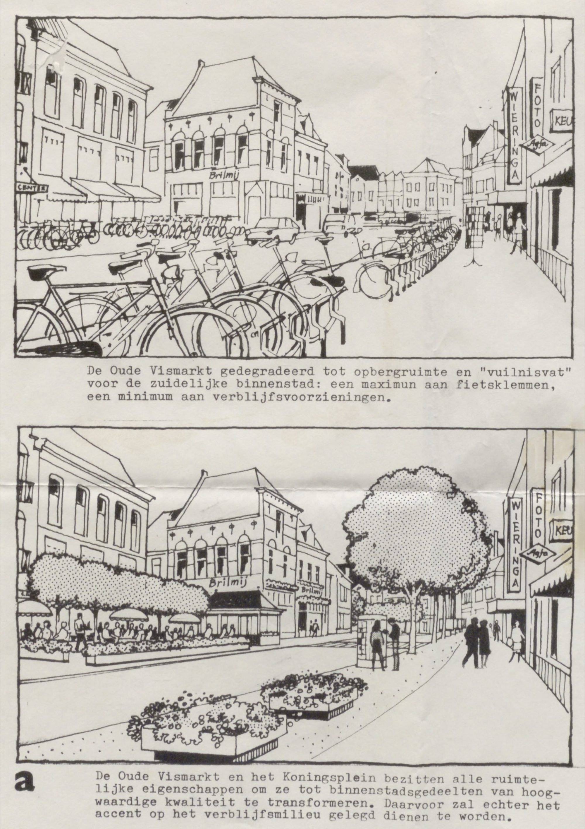 Ruim tien jaar geleden kreeg de Oude Vismarkt de inrichting zoals we die nu kennen. De gemeente heeft daarbij samengewerkt met ondernemers, bewoners en eigenaren van de Oude Vismarkt en het Koningsplein. Verder was de Fietsersbond een belangrijke partij aan tafel, want een van de lastigste discussiepunten was het fietsparkeren.