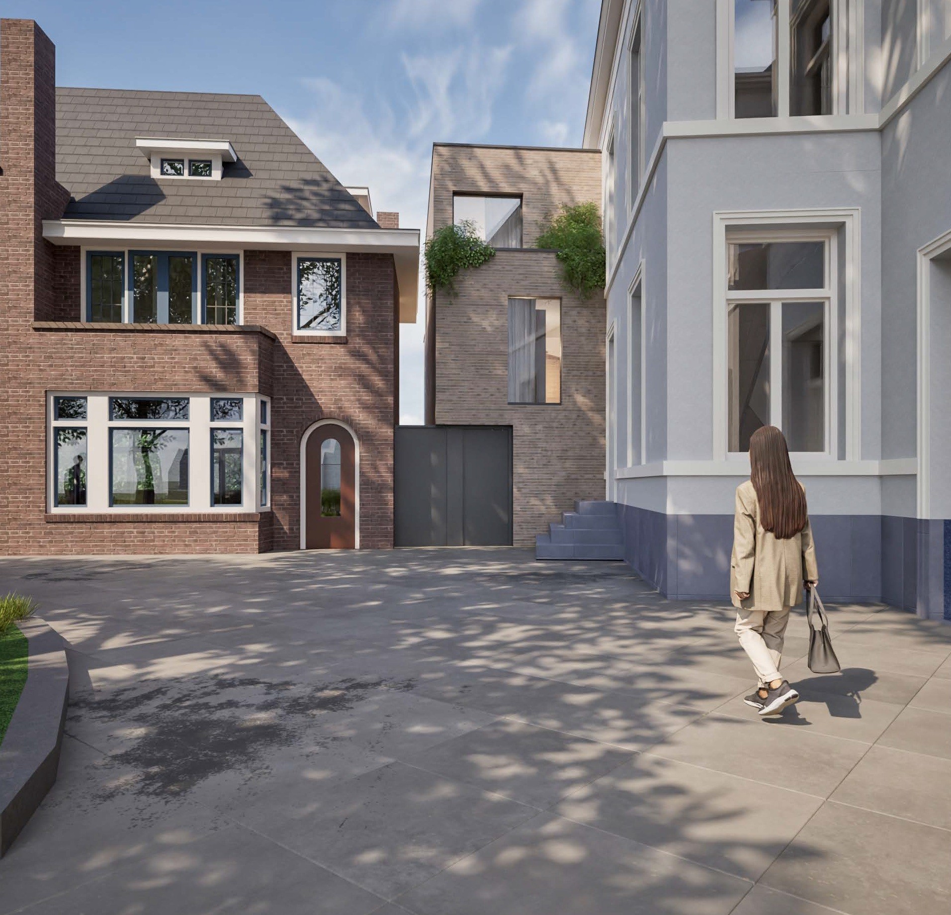 - De langsgevel van het nieuwe appartementencomplex, waar tevens de entree is, wordt abrupt afgebroken door de nieuwe tussenwoning.